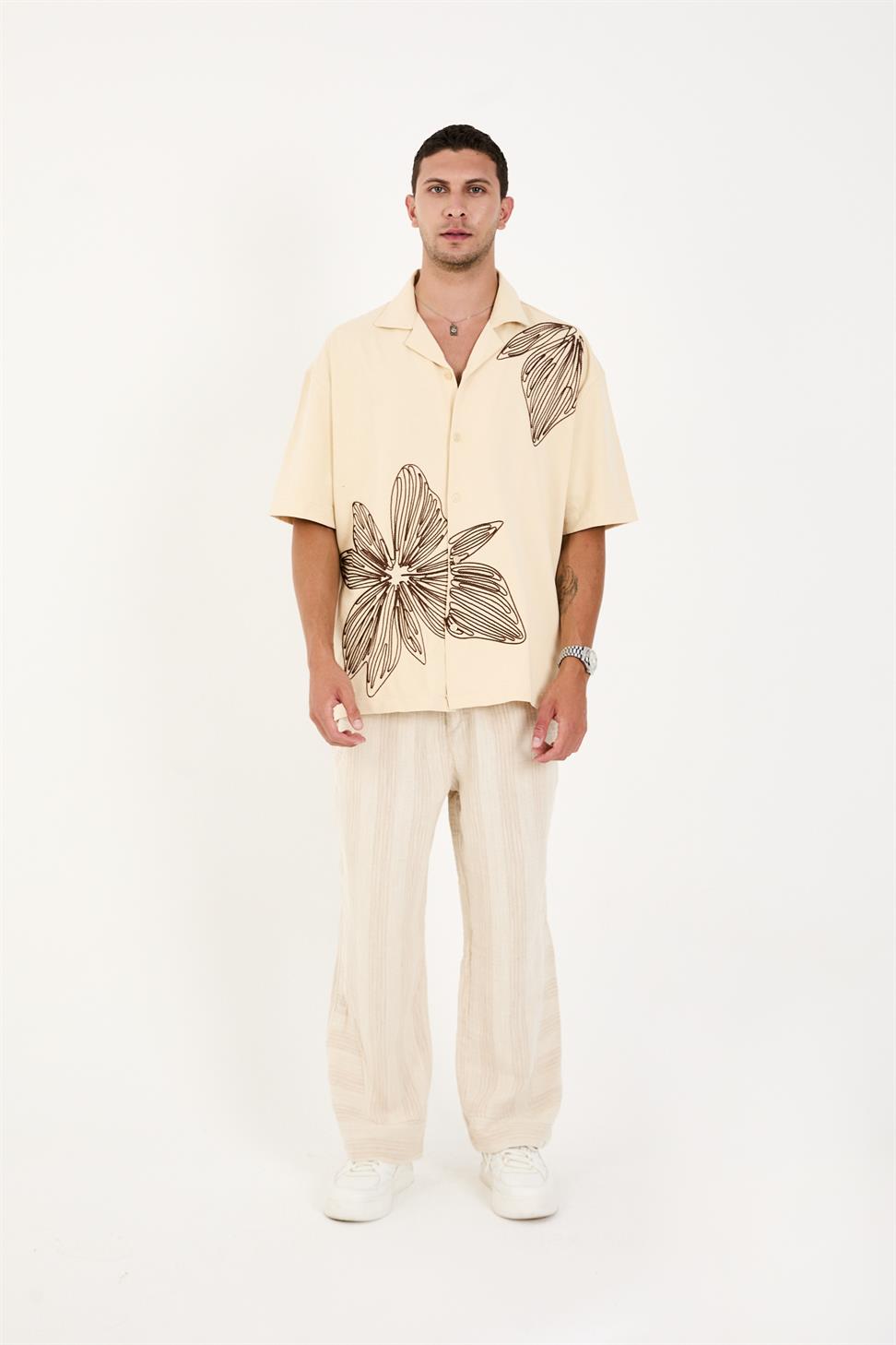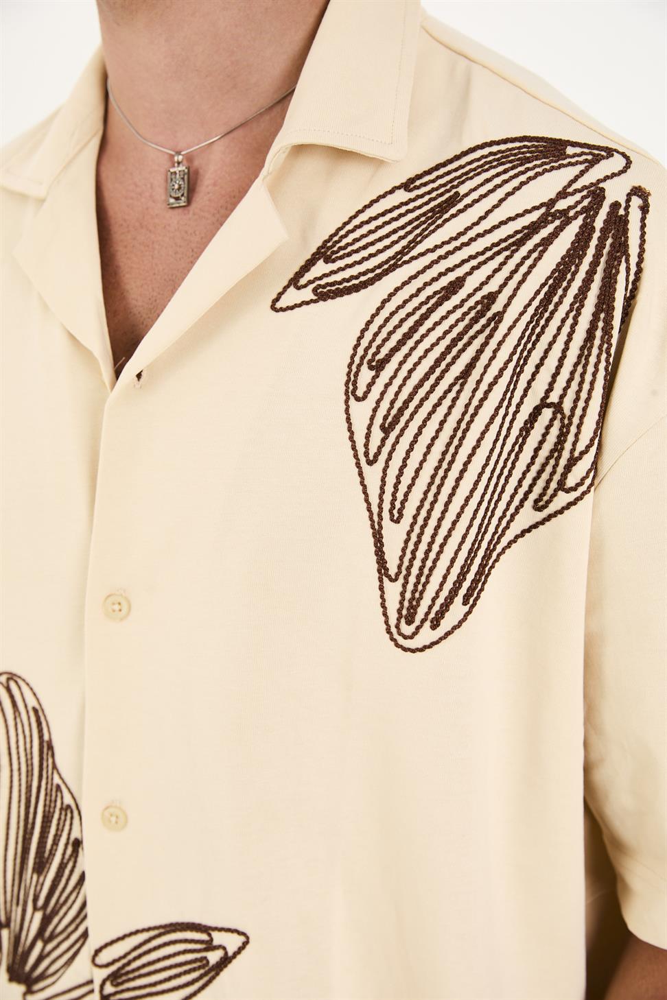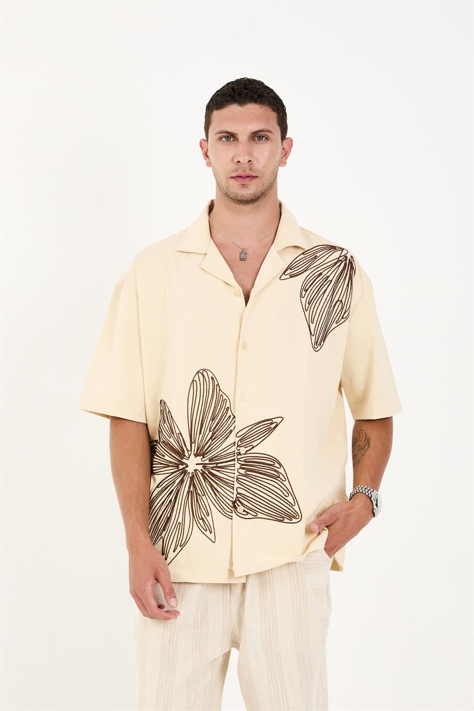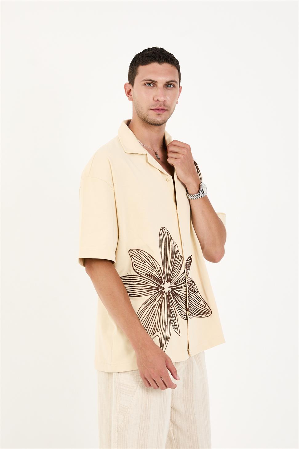 Designed with a Cuban collar and a relaxed fit, it provides a versatile look that works equally well for casual outings or smart-casual occasions. The subtle floral embroidery in tonal beige adds a sophisticated detail, keeping the shirt stylish yet understated.