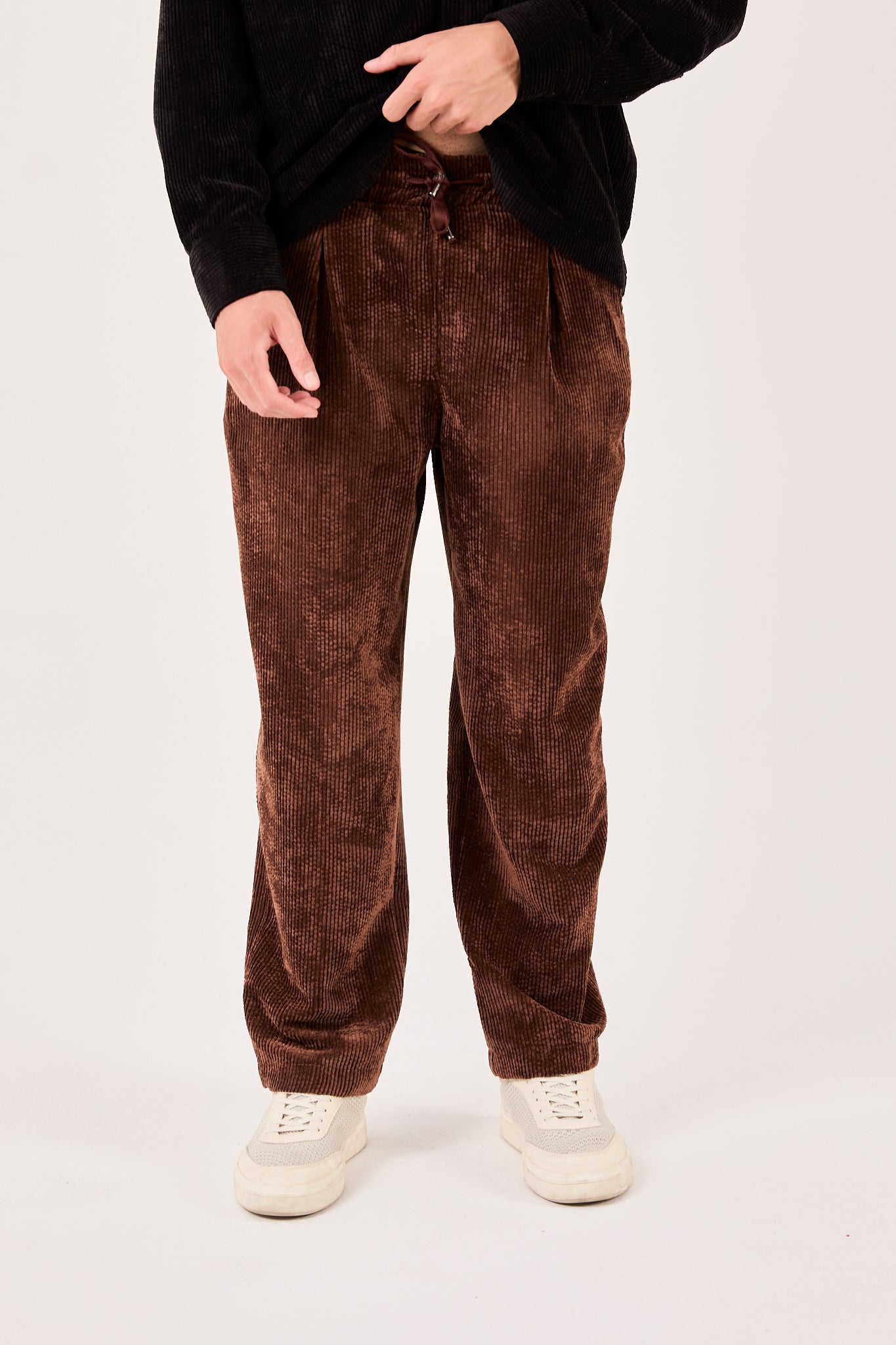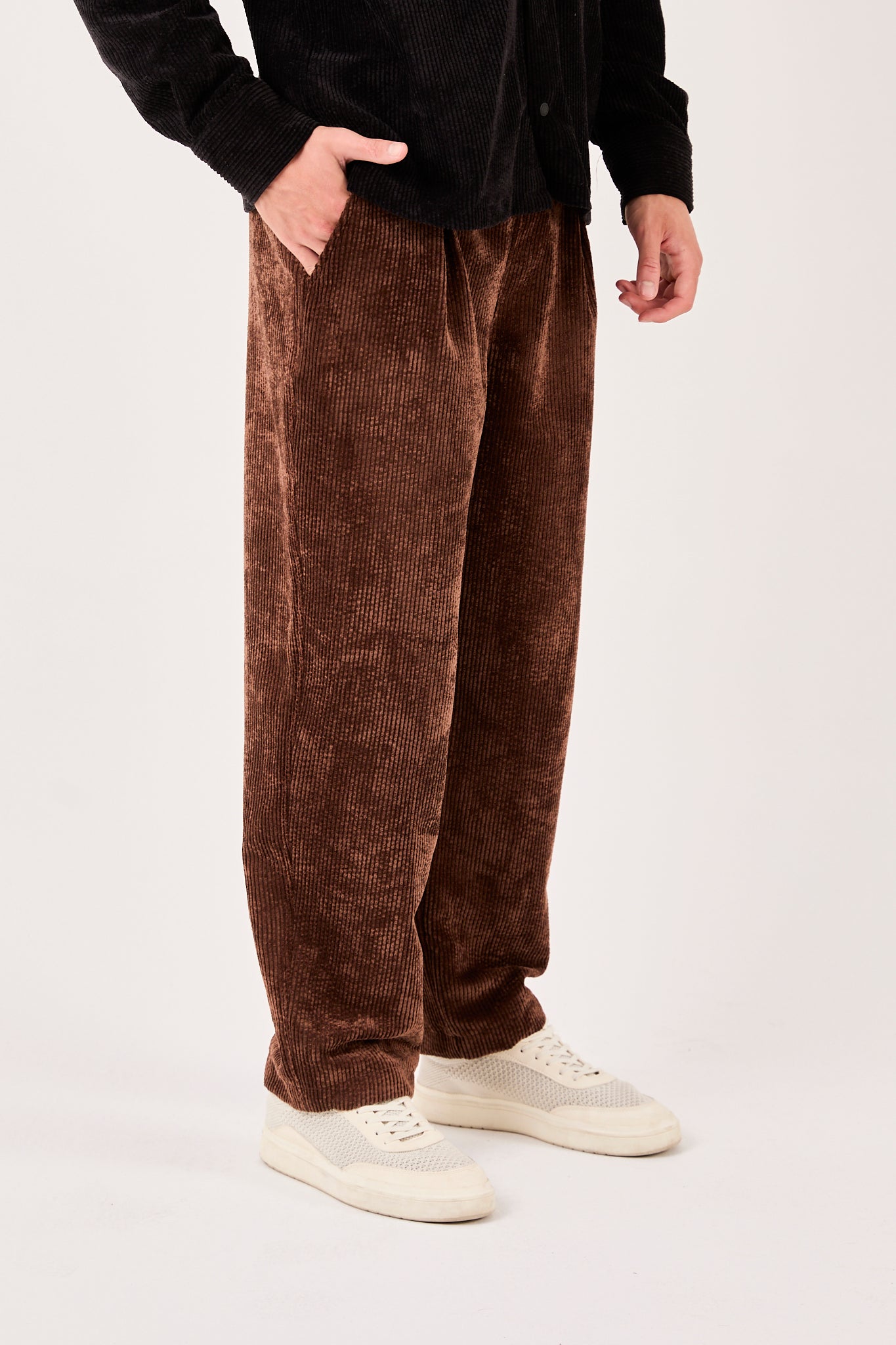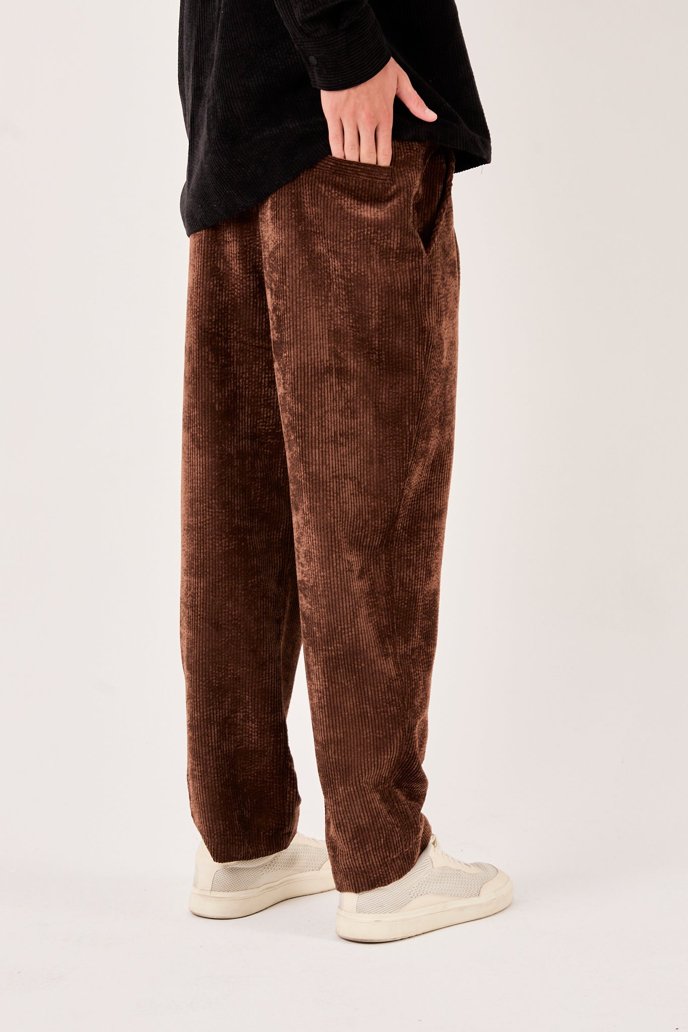 With its soft texture and wide-wale corduroy surface, these brown cord pants deliver all-day comfort and add a warm touch to your everyday style. The elastic, drawstring waist allows a customizable fit, while the relaxed cut offers freedom of movement. Side pockets add practicality, and the straight-leg design pairs easily with everything from sneakers to boots.