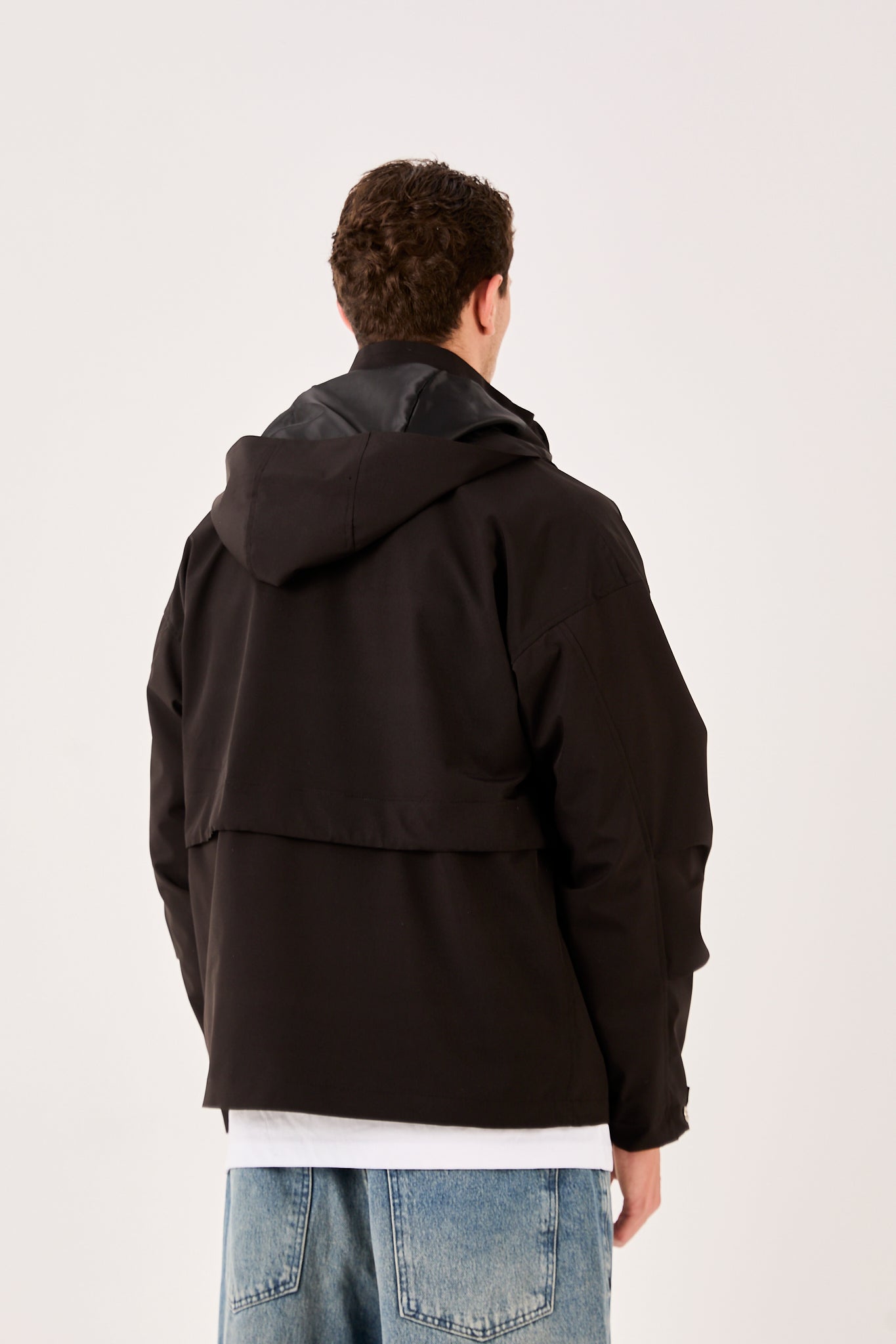X-2010 Mens Hooded Windbreaker Rain Jacket Black Zip Front Adjustable Hem