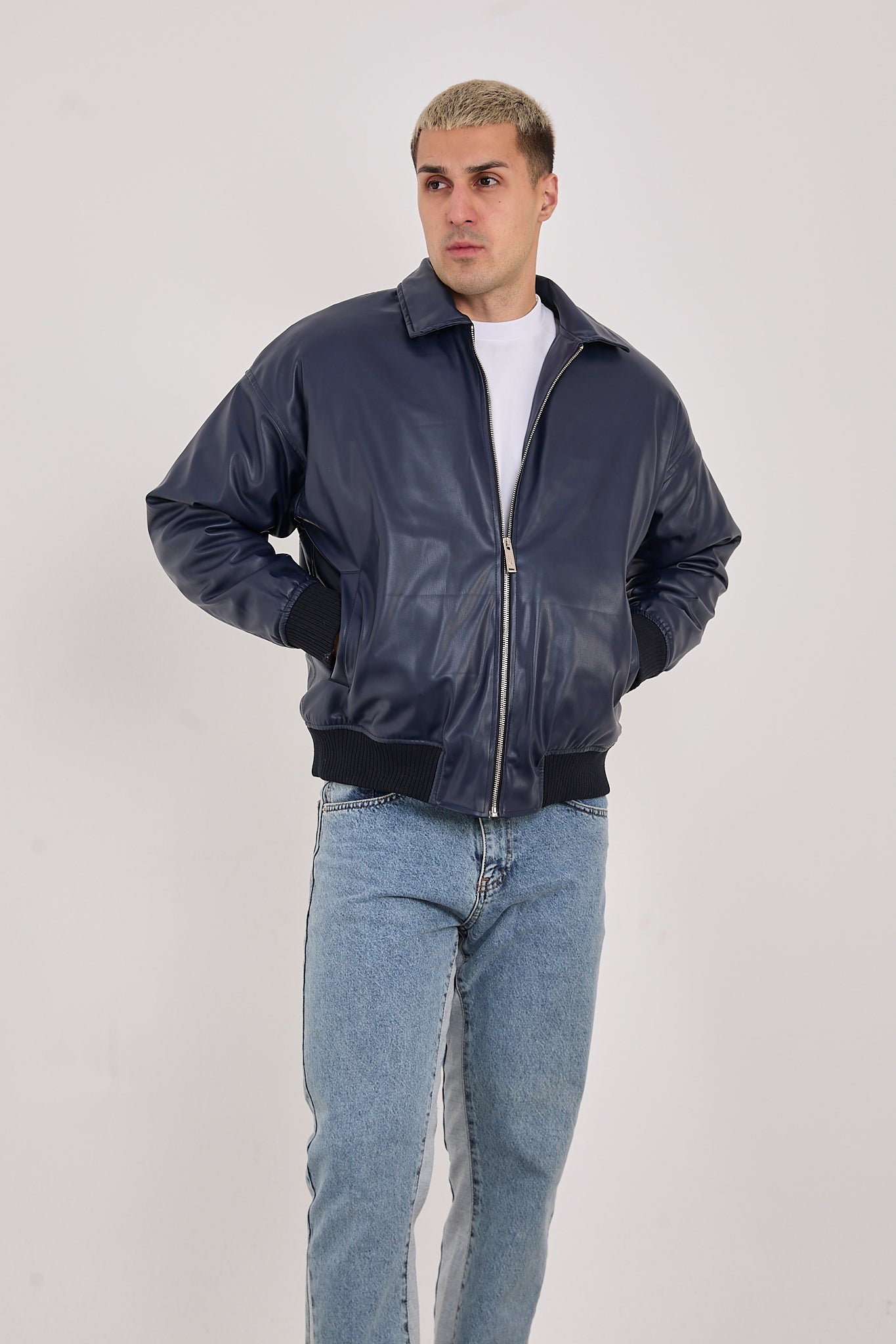 This men’s minimal bomber jacket combines modern design with everyday functionality. Featuring a smooth vegan leather outer, it offers a clean, structured look with a subtle sheen that elevates both casual and smart-casual outfits.