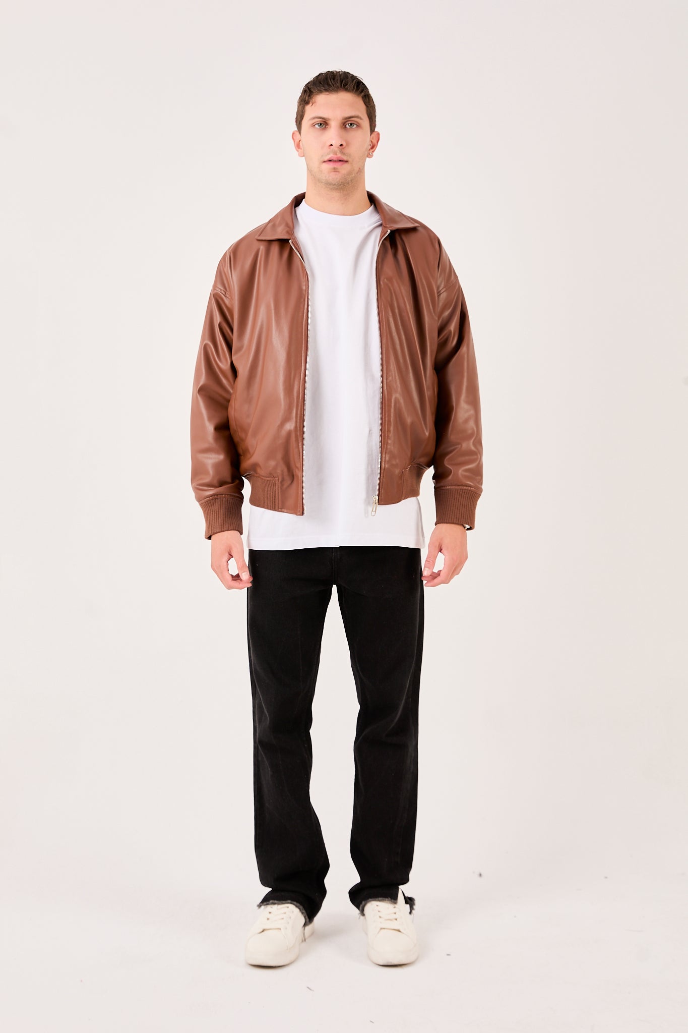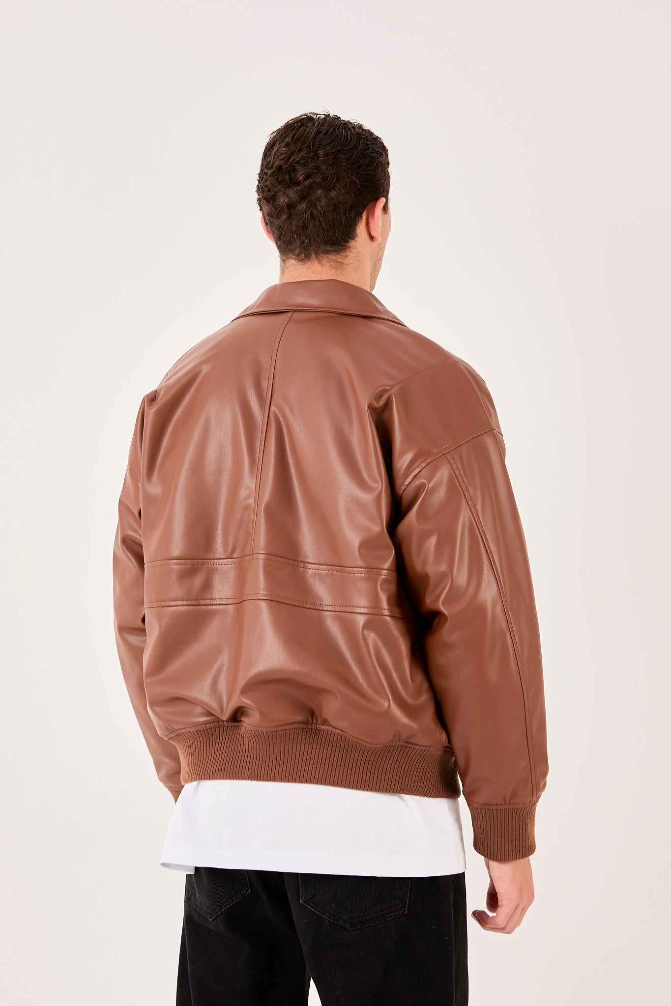X-2015 Mens Bomber Jacket Brown Zip Front Shirt Collar Ribbed Hem