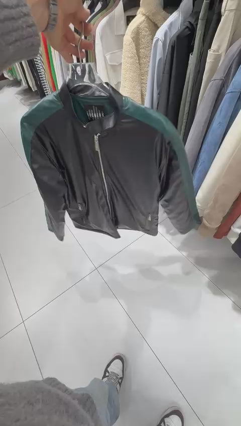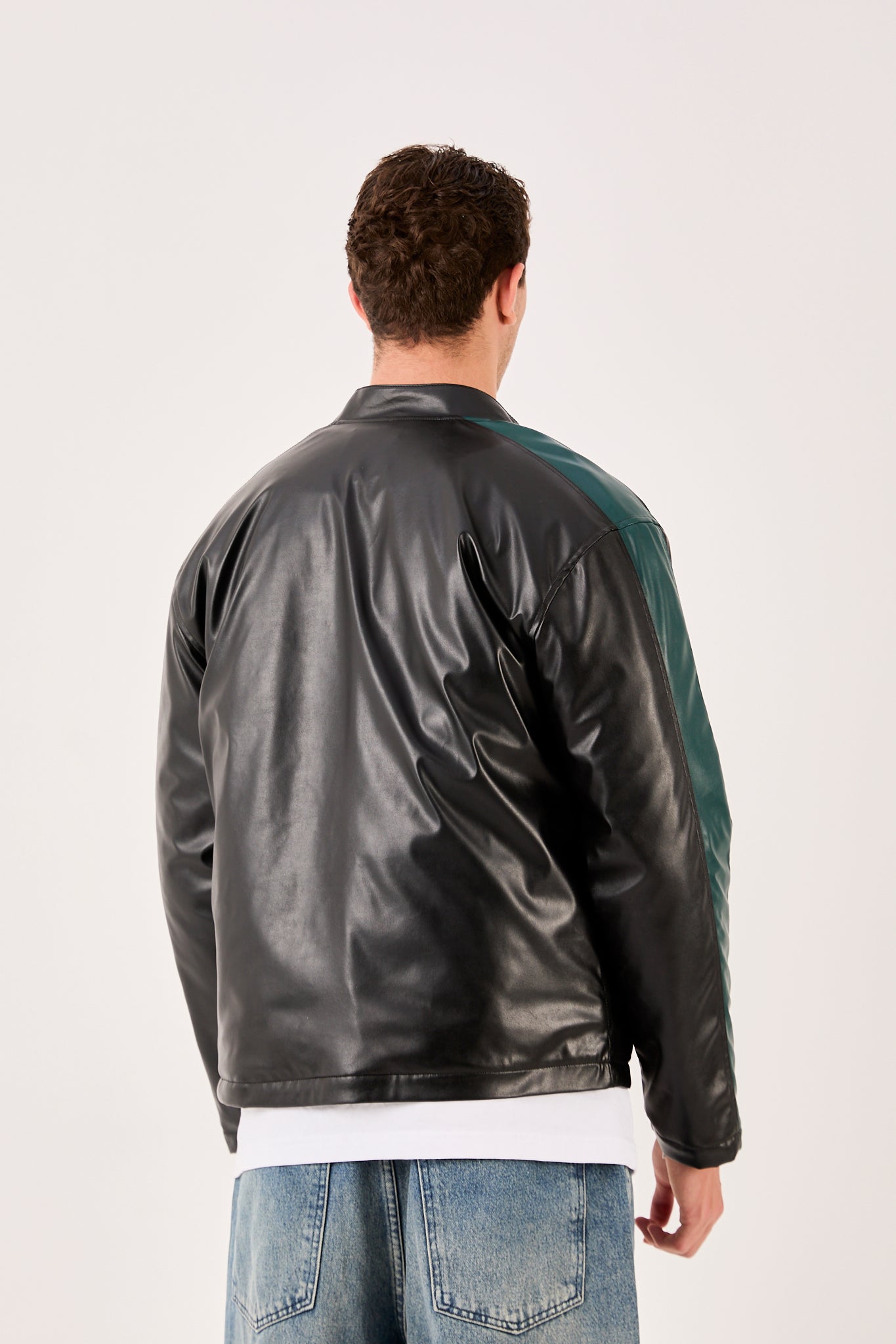 Own the road look with this men’s faux leather racer jacket in BLACK accented by a bold DARK GREEN stripe along the shoulders and sleeves. The clean zip front and snap tab stand collar give a modern moto vibe that pairs with denim, cargos, or joggers. Lightweight yet durable, it layers easily over tees or hoodies for everyday wear.