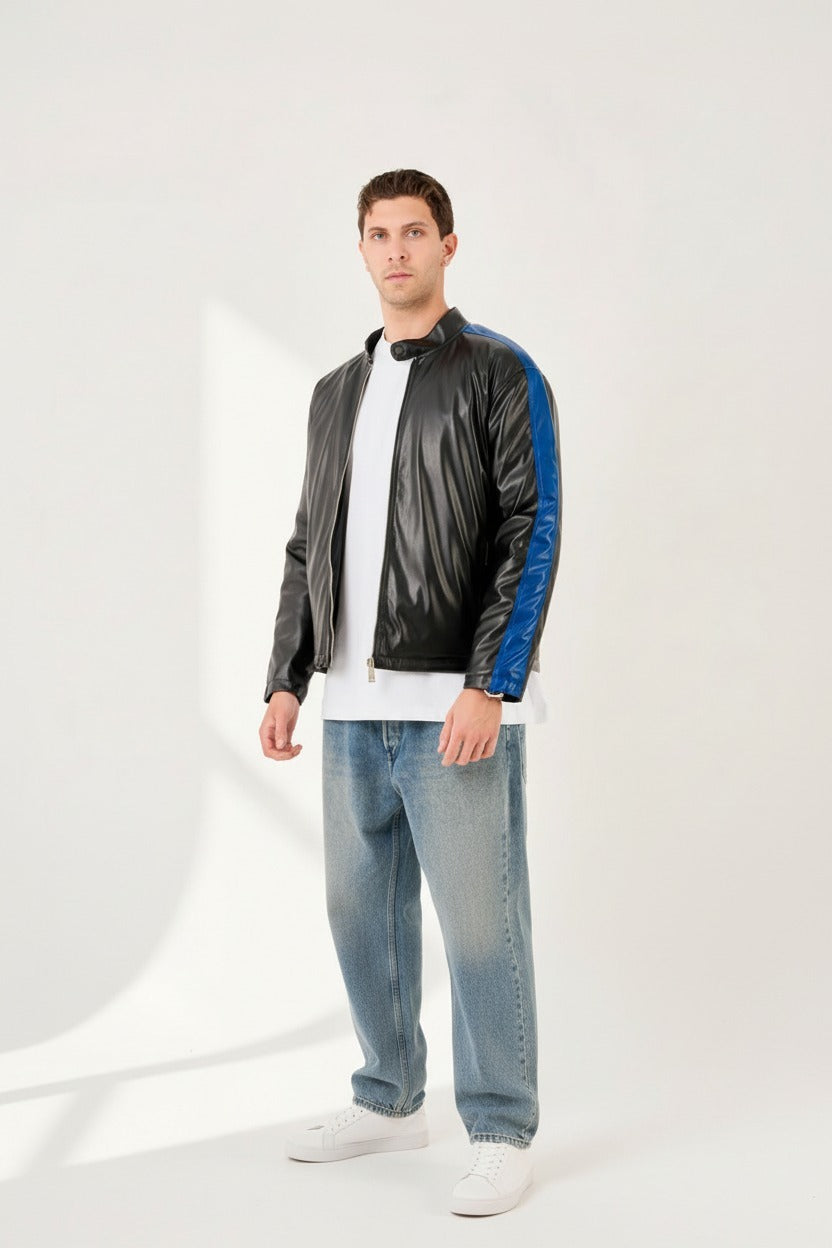 Sharpen your look with this men’s faux leather racer jacket in SAKS BLUE, elevated by a crisp WHITE stripe running along the shoulders and sleeves. The sleek zip-front design and snap-tab stand collar create a modern moto-inspired silhouette that pairs effortlessly with denim, cargos, or joggers. Lightweight yet durable, it layers comfortably over t-shirts or hoodies for everyday wear.
