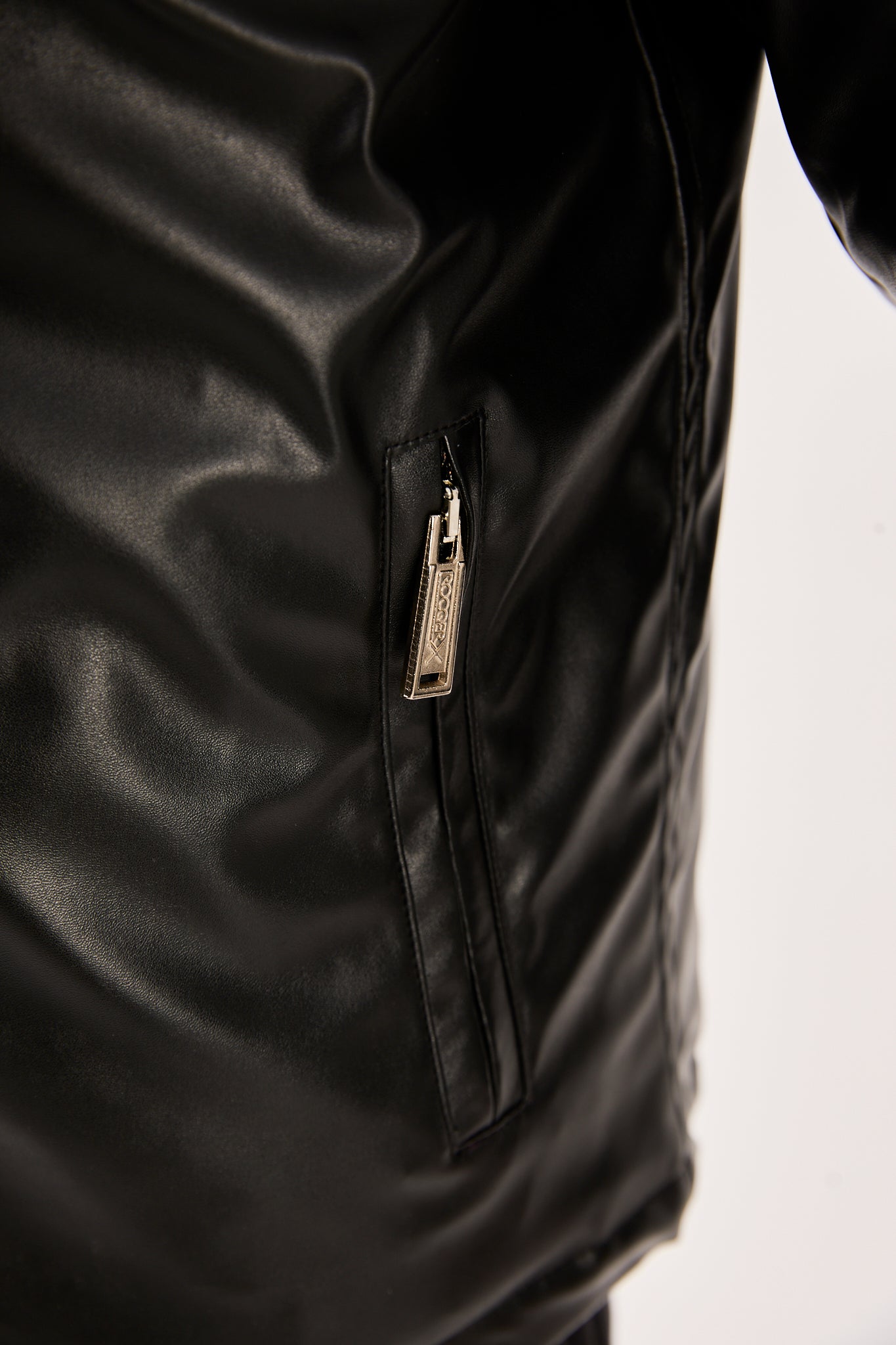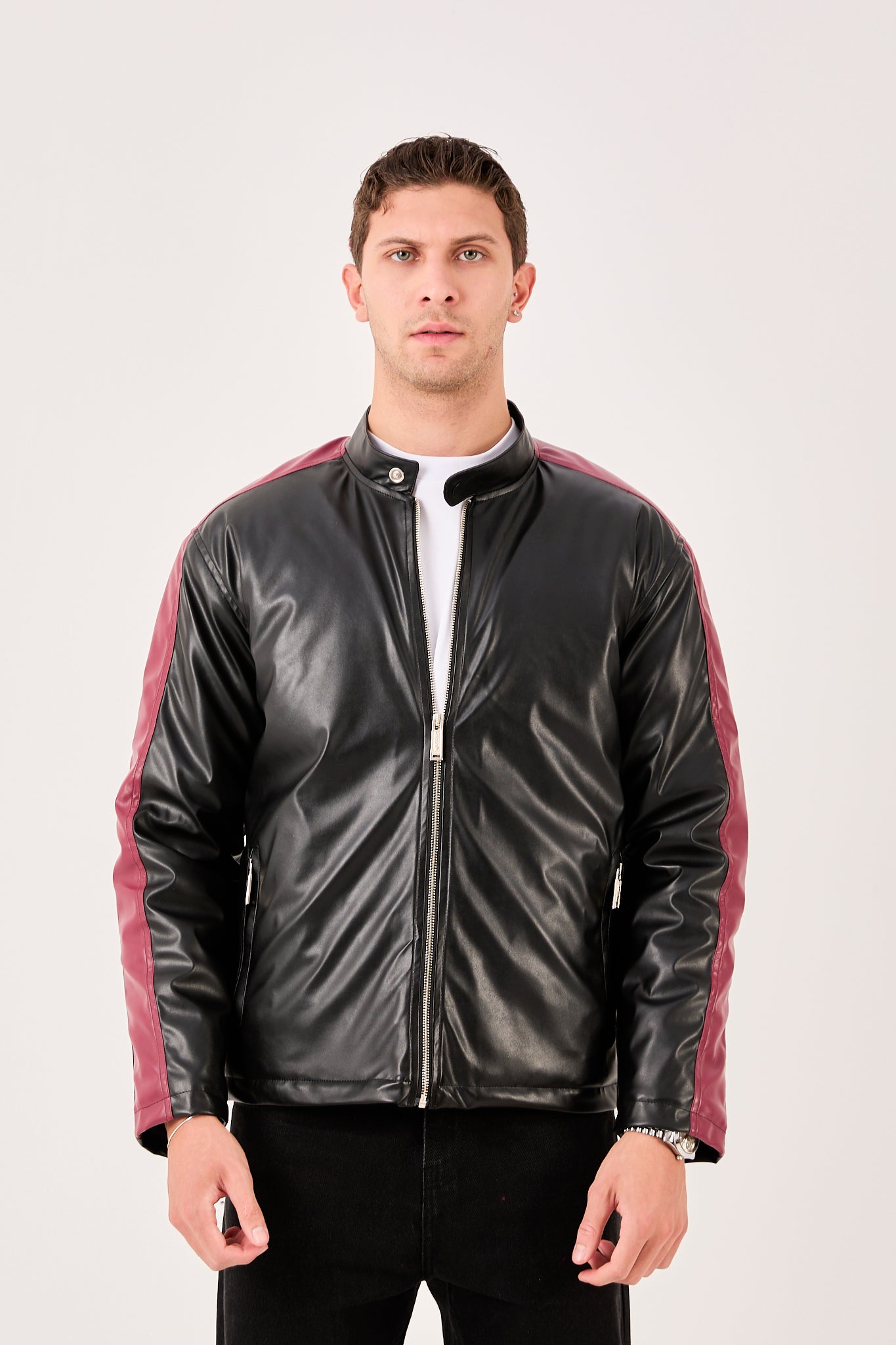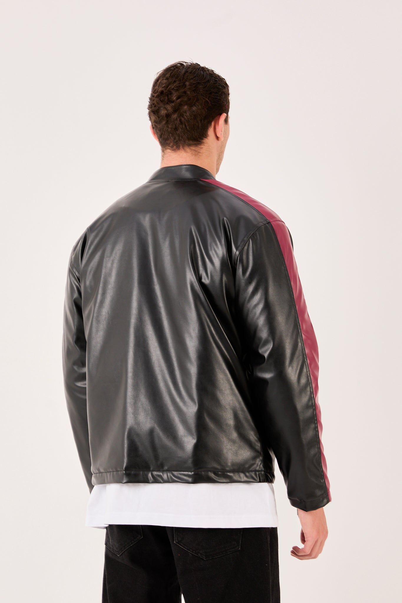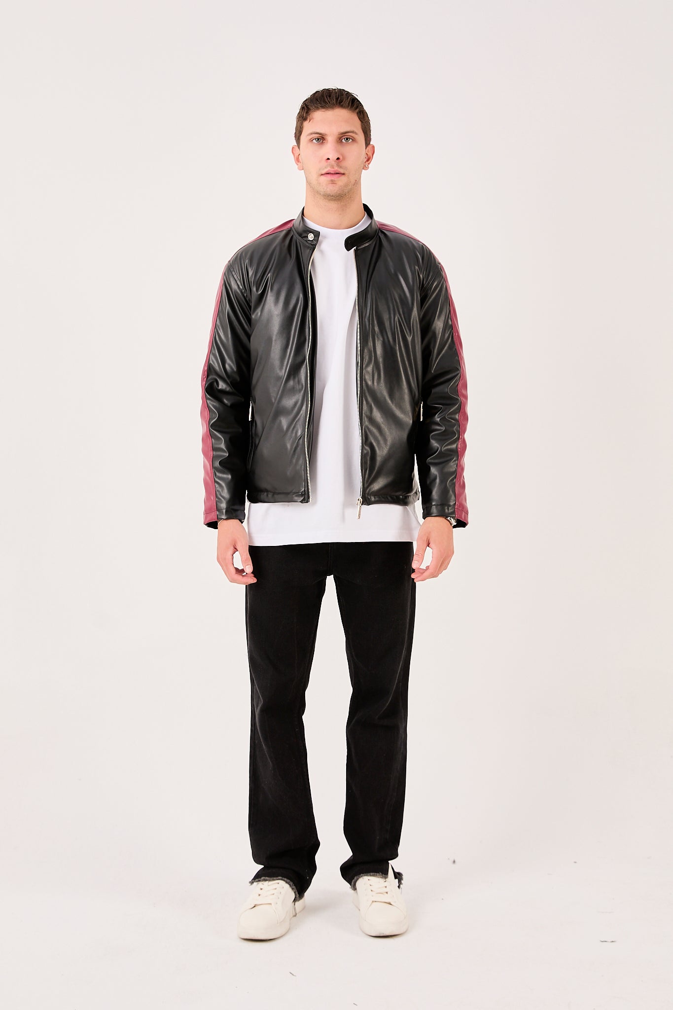 Turn heads with this men’s faux leather racer jacket in BLACK with a bold BURGUNDY contrast stripe along the shoulders and sleeves. The clean zip-front and snap-tab stand collar deliver a modern moto look that pairs with denim, cargos, or tailored joggers. Lightweight yet durable, it layers easily over tees or hoodies for everyday wear.