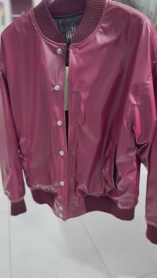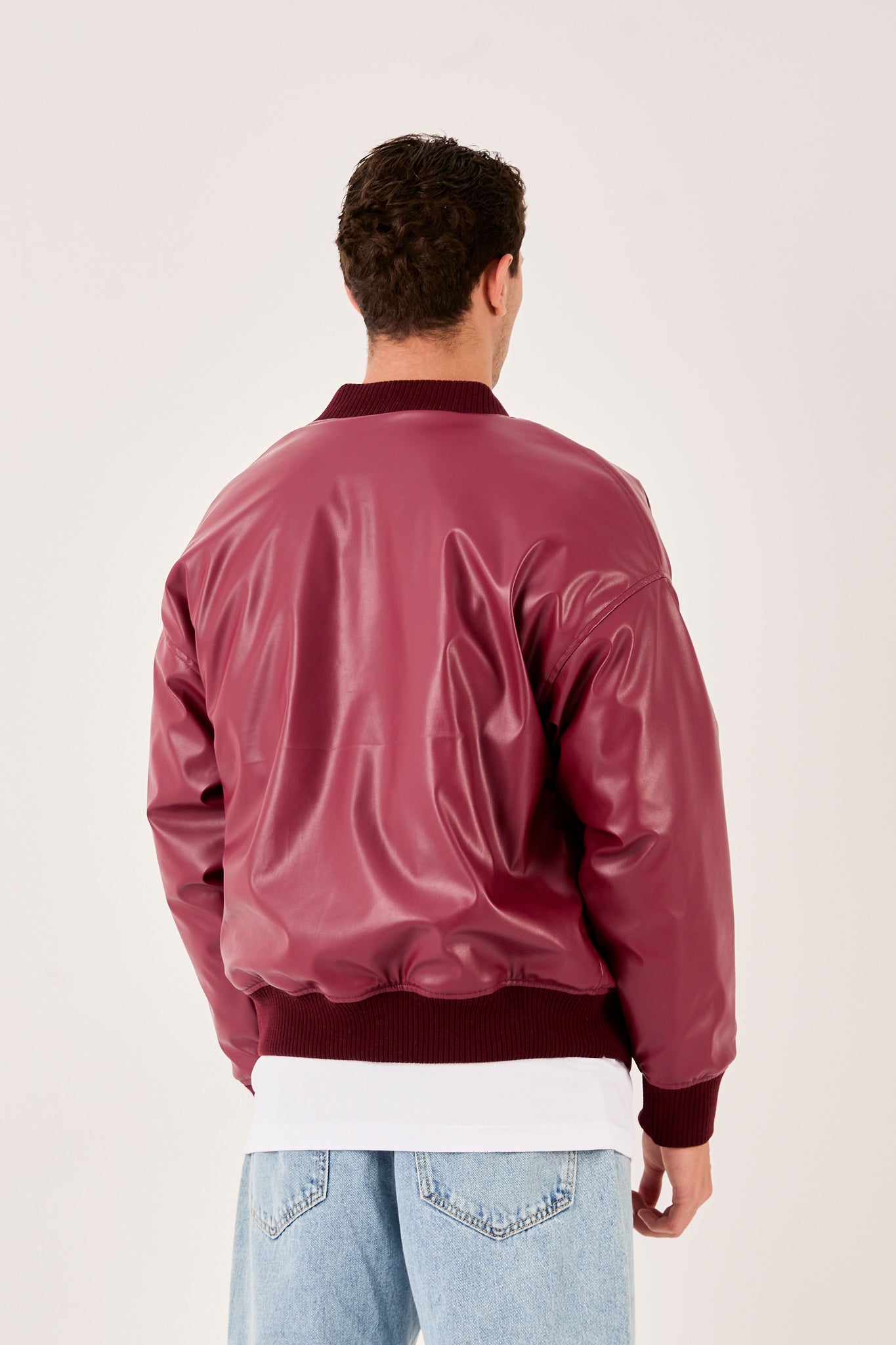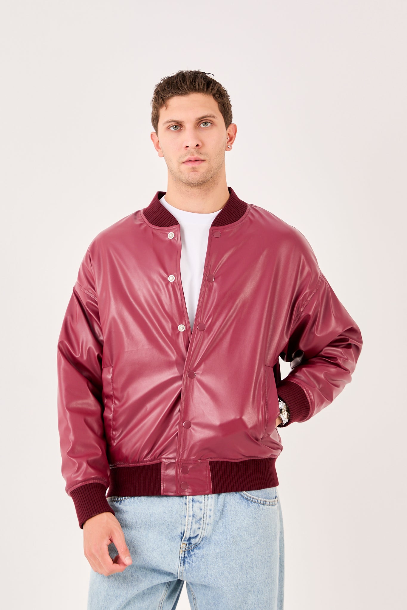 Make a statement with this burgundy faux leather bomber. A clean snap-button front, ribbed collar cuffs and hem, and a smooth finish deliver a modern varsity look that moves from street to smart casual with ease. Lightweight yet durable, it layers comfortably over tees or hoodies for everyday wear.