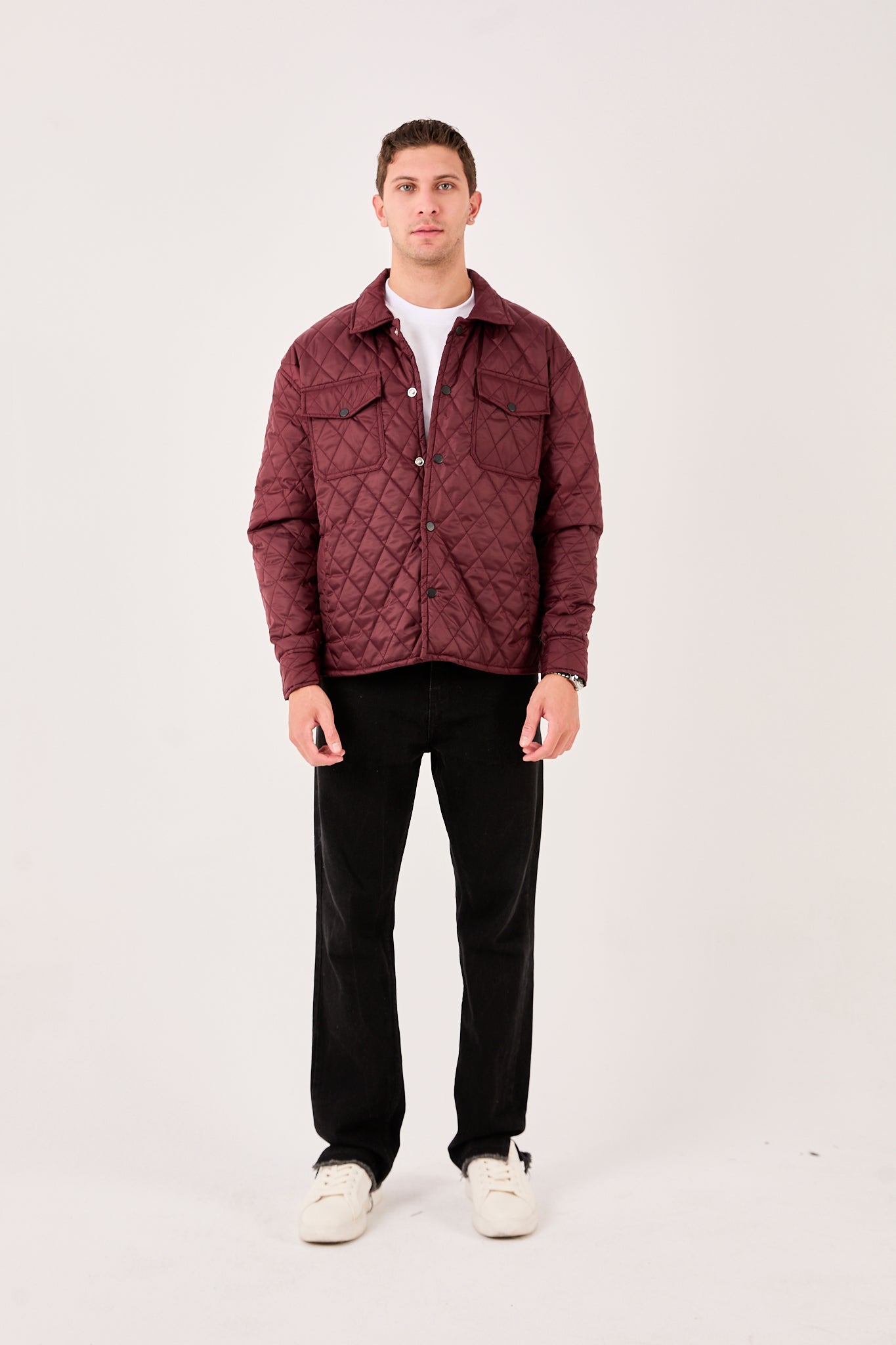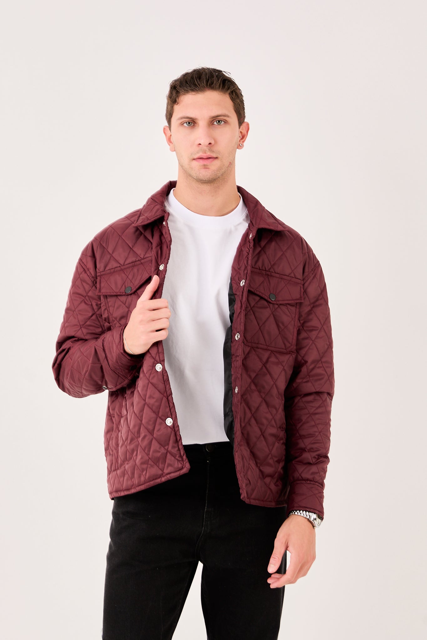 Build your everyday look with this Men’s Quilted Snap Button Jacket in BURGUNDY. The diamond-quilt design and shirt-style collar deliver a clean, modern silhouette, while light insulation adds warmth without bulk—perfect for transitional weather and easy layering over tees or hoodies.