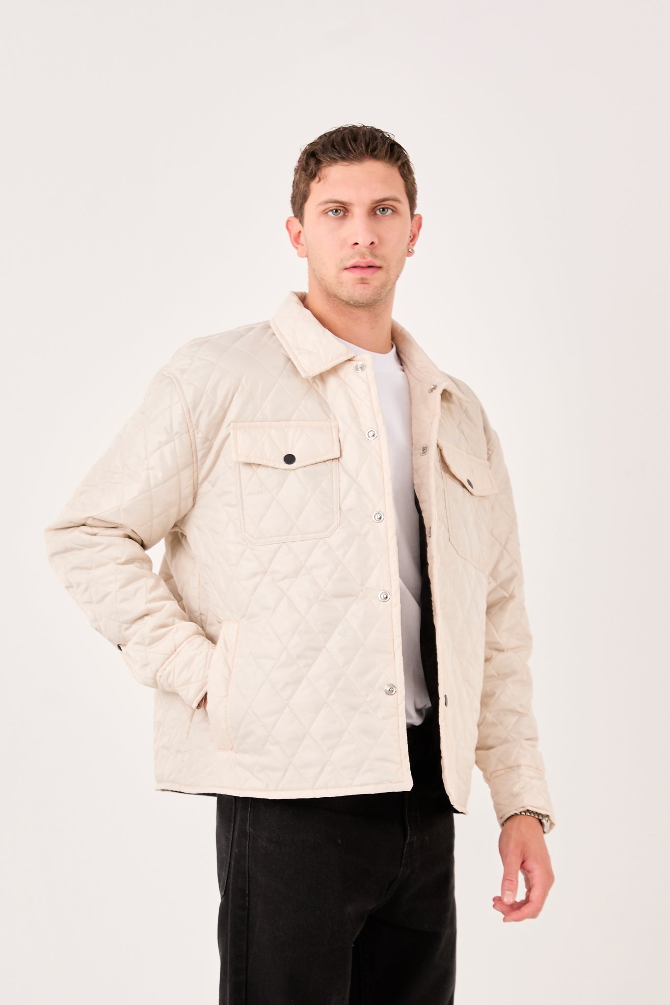 Refresh your everyday layers with this Men’s Quilted Snap Button Jacket in BEIGE. The diamond-quilt pattern and shirt-style collar create a clean silhouette, while lightweight padding adds warmth without bulk—ideal for transitional weather. Easy to layer over tees, hoodies, or knits.