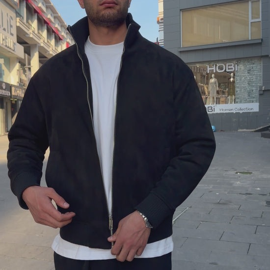 X-2021 Men’s Soft Suede Zip-Up Bomber Jacket – Blac