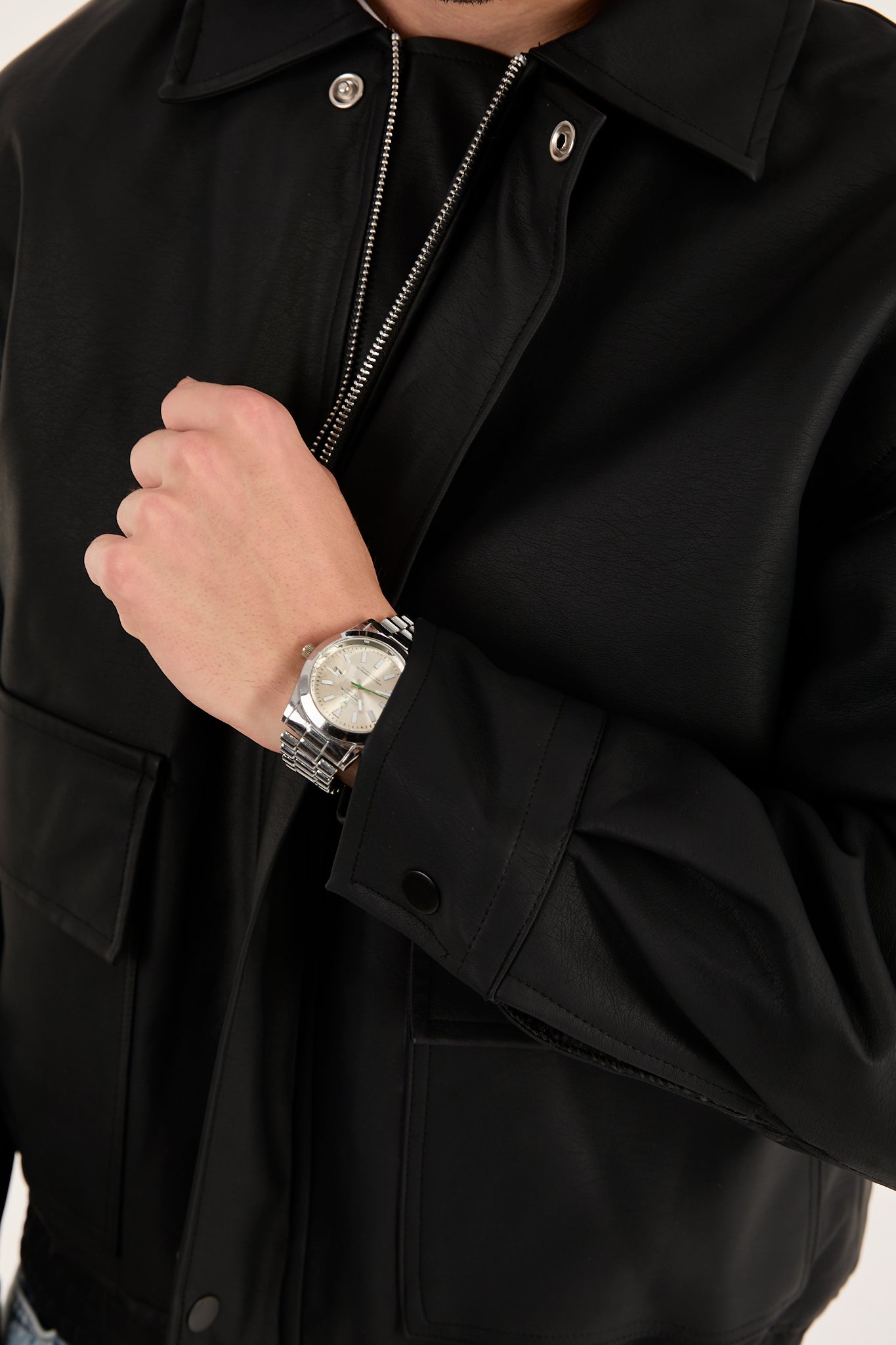 X-2014 Men’s Vegan Leather Zip Jacket with Flap Pockets – Black