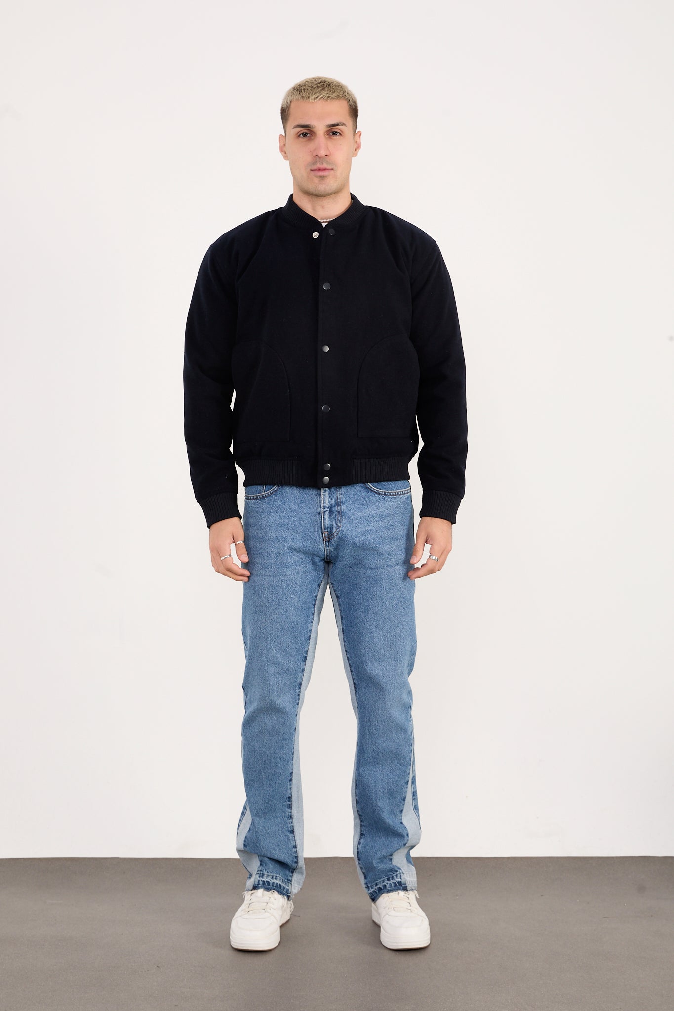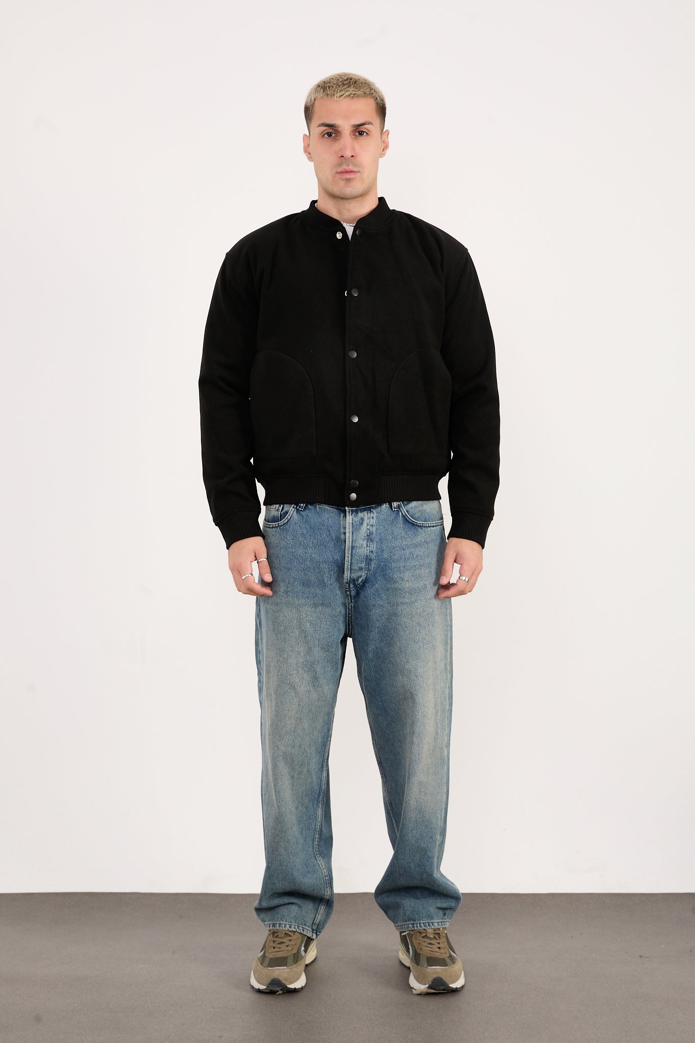 The X-2026 bomber jacket in black is designed with a quilted inner lining to provide extra warmth while maintaining a clean and structured silhouette. Crafted from a durable wool-blend fabric, this jacket delivers a sharp, modern look ideal for everyday and city wear.