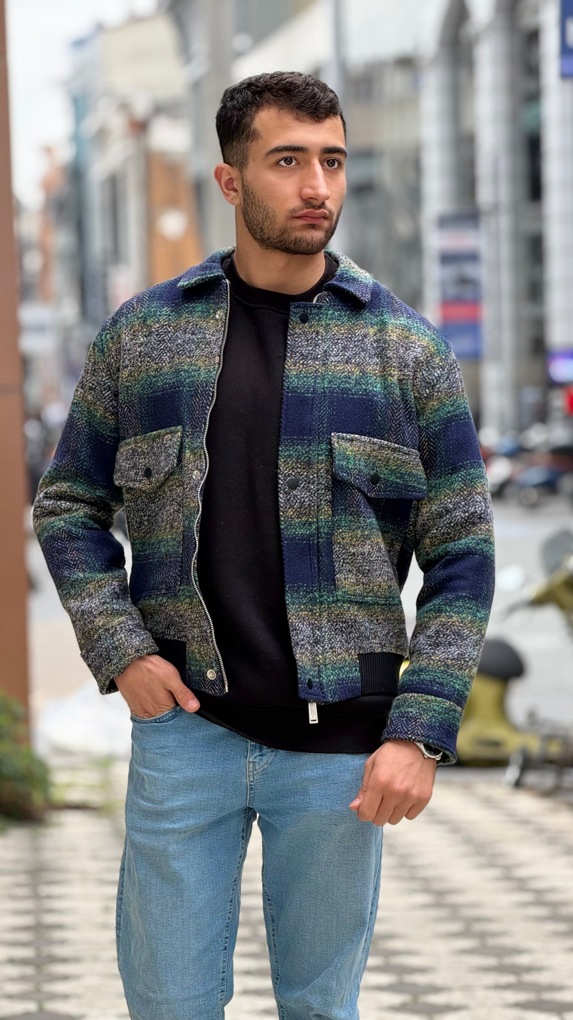 Featuring a rich multi-tone color palette of green, navy, beige and grey, this jacket stands out with its subtle herringbone weave texture and oversized check pattern. The structured collar, reinforced button closure and clean front construction deliver a refined yet contemporary streetwear aesthetic.