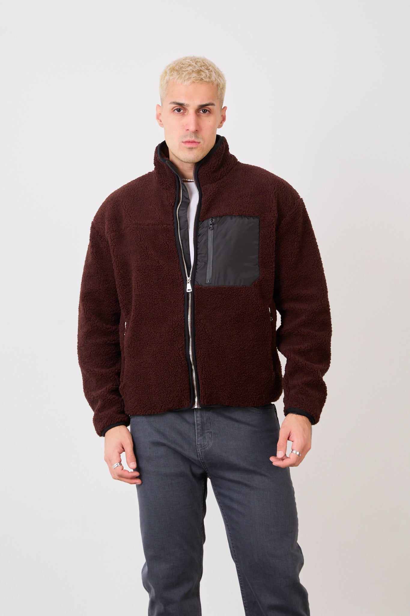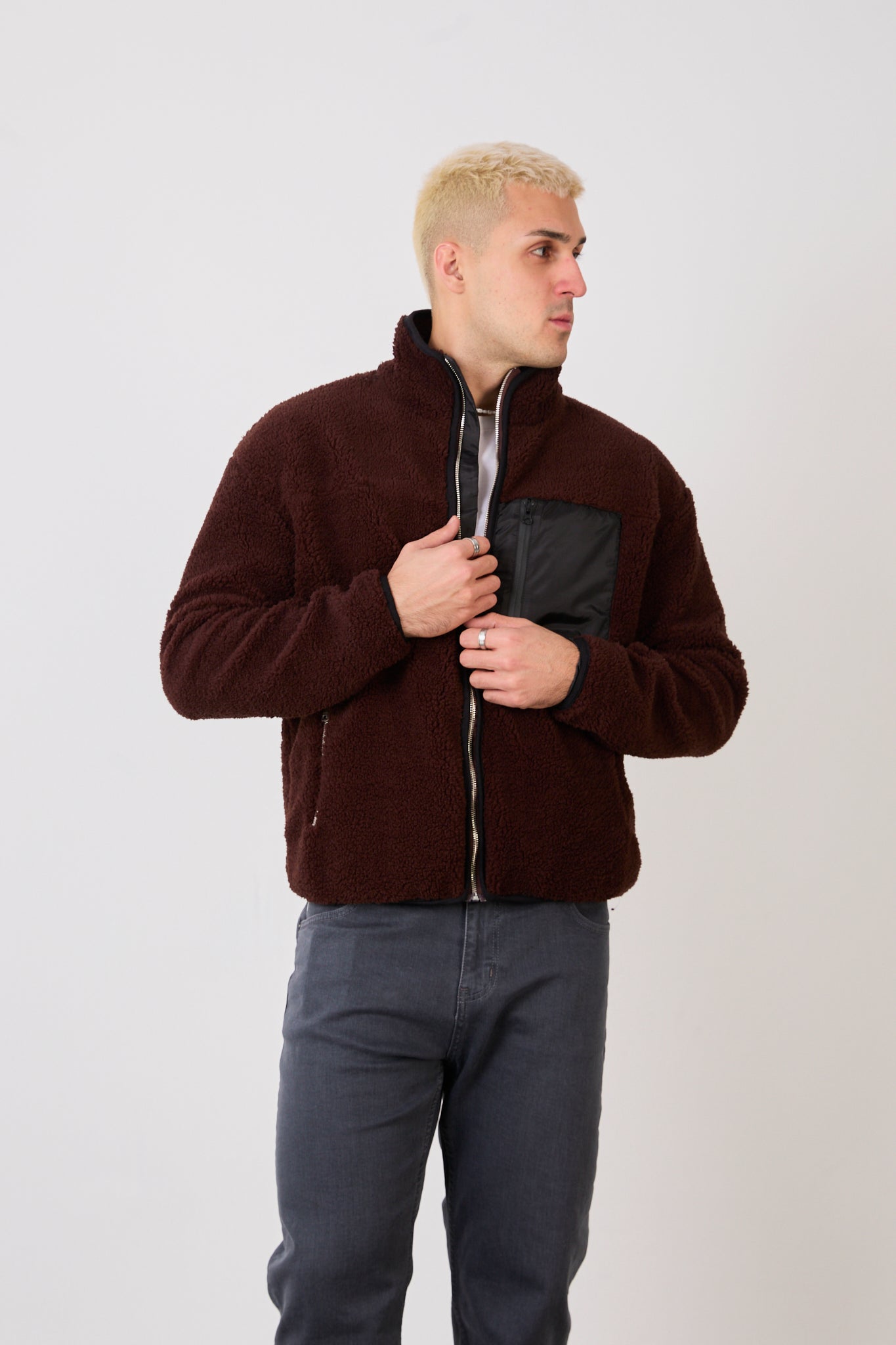 This men’s brown zip-up high neck jacket delivers a refined streetwear look with a warm, modern tone. The contrast zip chest pocket adds a functional detail while enhancing the clean, minimalist design.