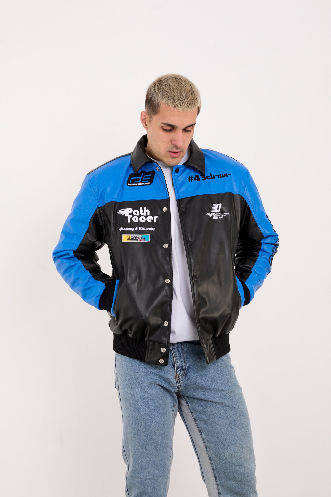 This men’s blue and black vegan leather racing jacket delivers a bold motorsport-inspired look with a modern streetwear edge. The striking color contrast and statement patch details create a dynamic design that stands out while maintaining a clean silhouette.