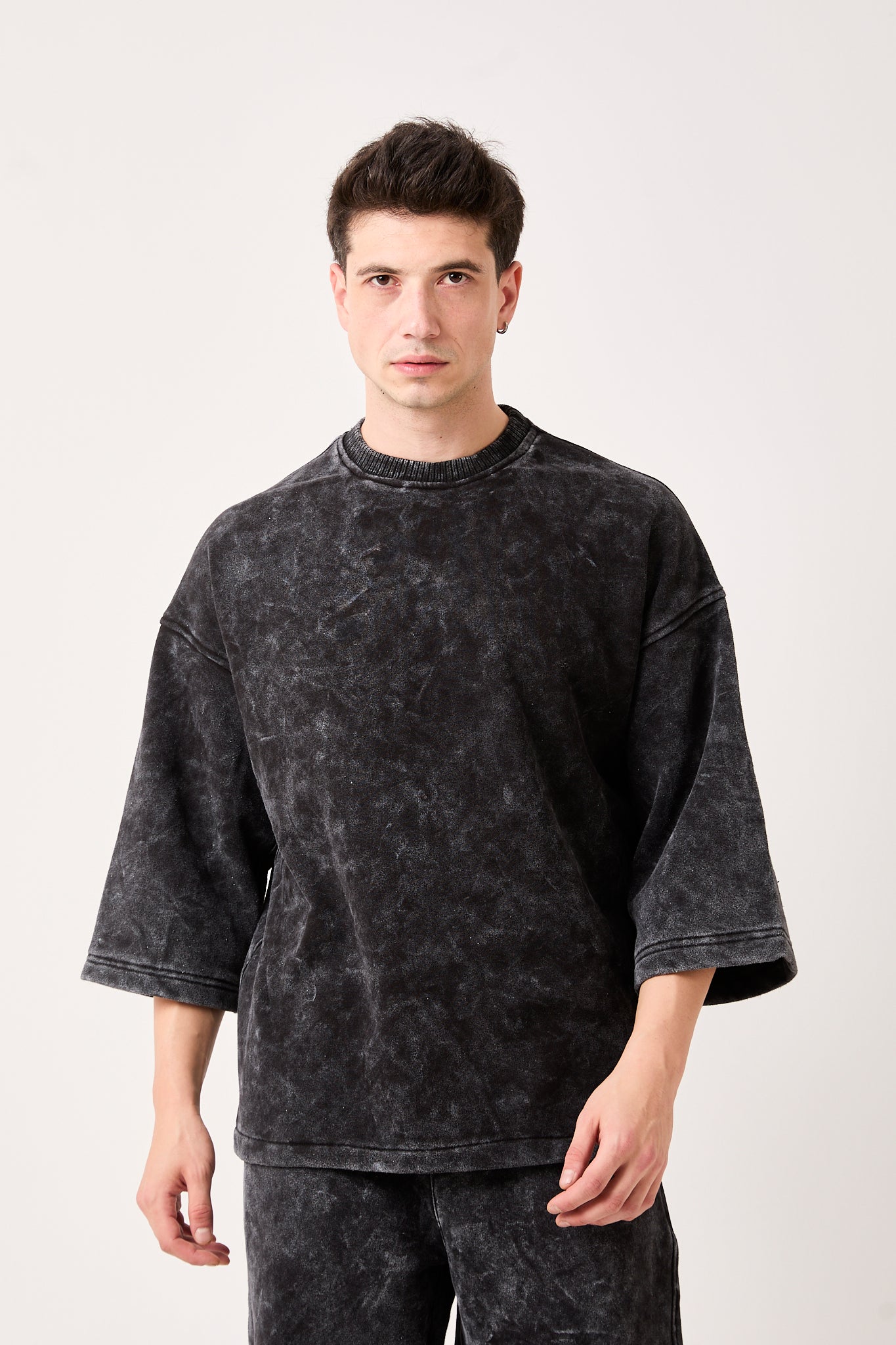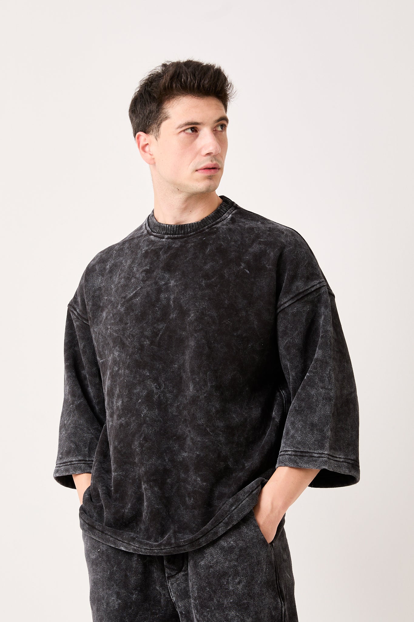 The wide ¾ sleeves, dropped shoulders, and ribbed crew neckline create a unique silhouette that stands out in casual looks. Each piece features a washed charcoal tone, giving it a distinctive, slightly faded appearance for a lived-in, premium feel.