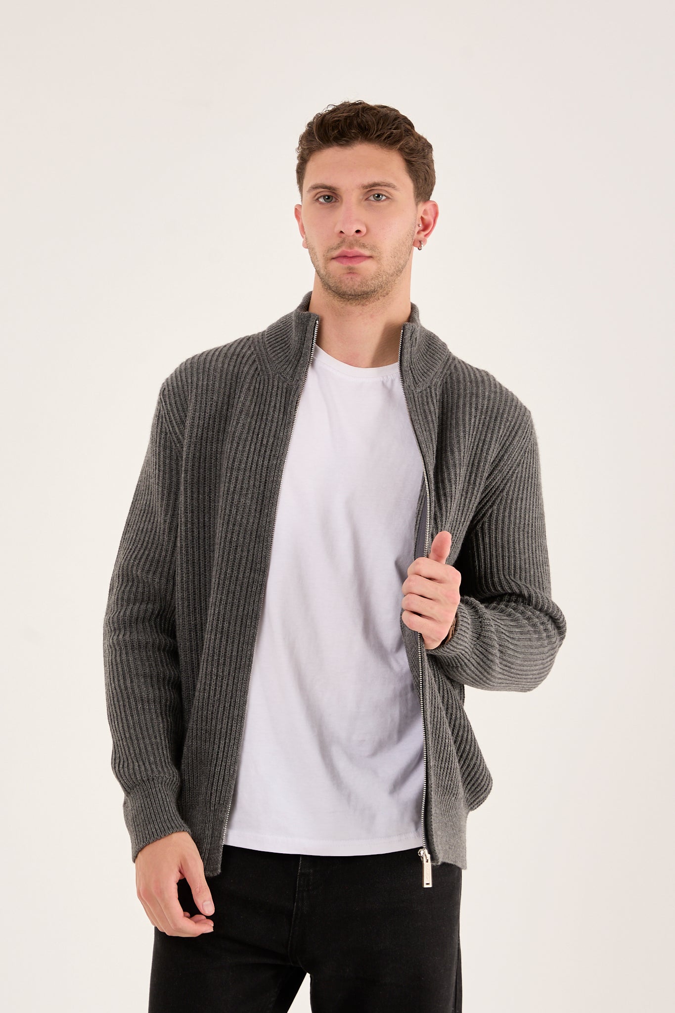X-5003 Men’s Grey Ribbed Zip-Up Knit Cardigan – Premium Heavy Knit