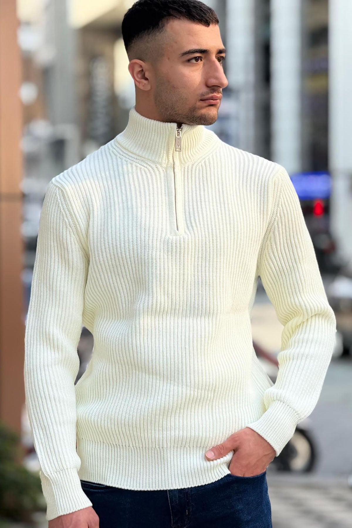 X-5003 Men’s Cream Half-Zip Ribbed Knit Sweater