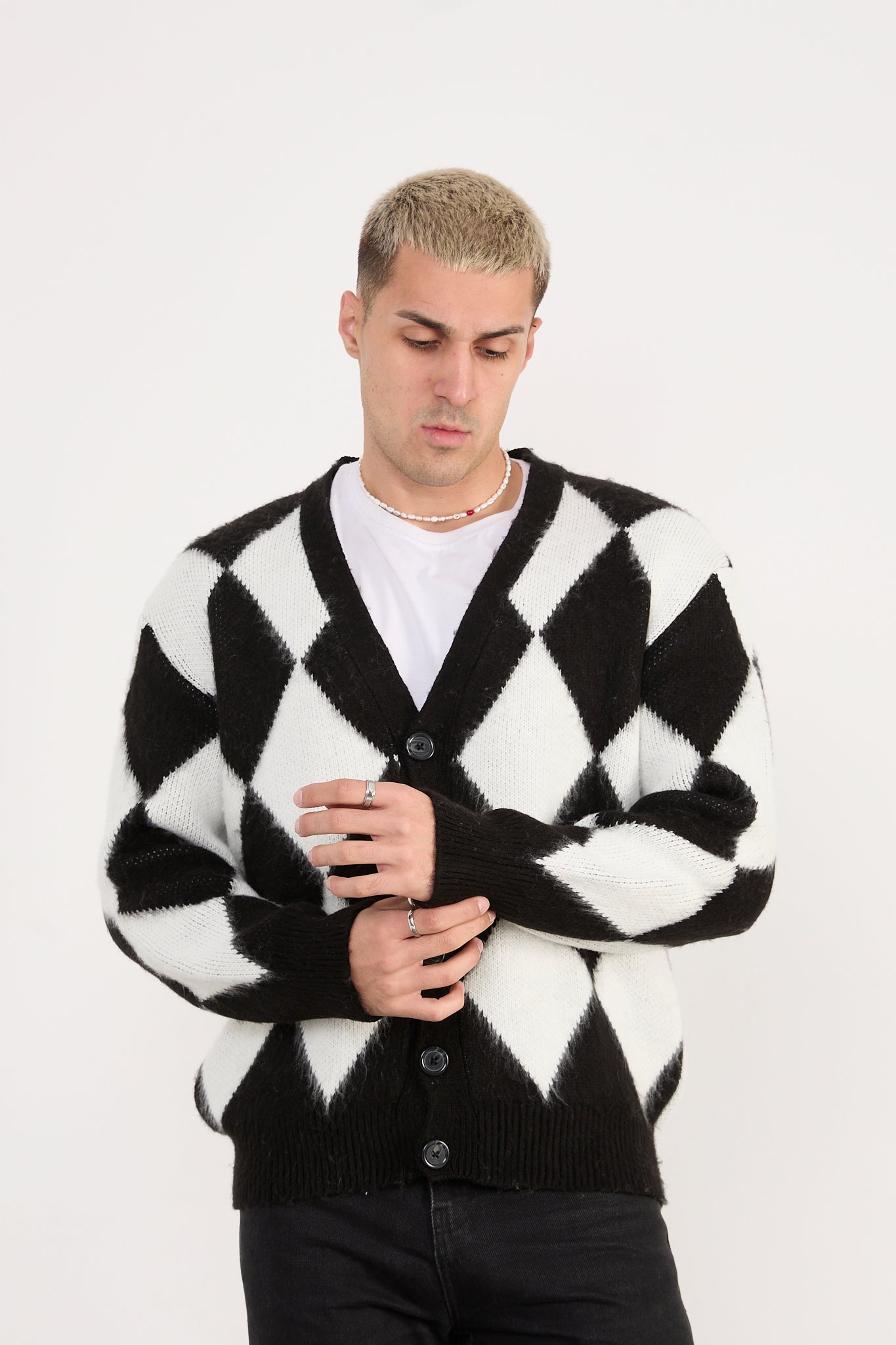 X-5007 Men’s Argyle Knit Cardigan – Black & White